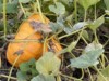 This Pumpkin is on my son Ethan's 2147 Marshall that got yellow vine disease back in July. Wow this plant has Numerous pumpkins. The majority have aborted but a few have stuck,,,,,probably they are on unaffected sections of vine. Where the vascular system isn't plugged up from the yellow vine
