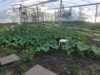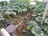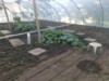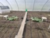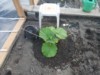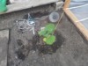 Raised walkway, need more cinder blocks, patch divided by 4 equal areas. 1 pumpkin plant and a watermelon in each section