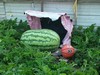 Fiona, 23 dap milk jug & 5 gal bucket comp. I've got pieces of boogie board foam under the bucket & jug to be the same level the melon is.