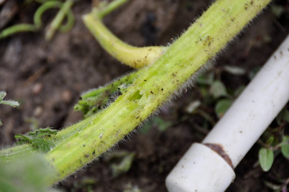 Now, here is roughly the same section of vine back on June 12th, 2013. That huge hit came from a hailstone. It later healed, but the vine was permanently degraded in my estimation.