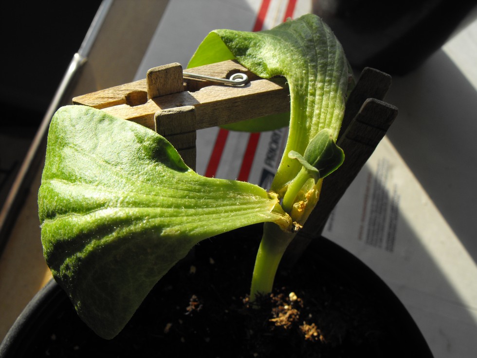 I know this looks horrible but wait...it gets worse,lol. I grafted a (just broke the surface w/ the hulls still on Carolina Cross scion onto the rootstock of an AG that went south on a graft 2 weeks ago. I save all my plants that don't take to grafts for experiments like this. This graft is out of the healing chamber and is 5 days old. Watching with curiosity. First day with full sun on it and the cot leaves began to open as you can see.