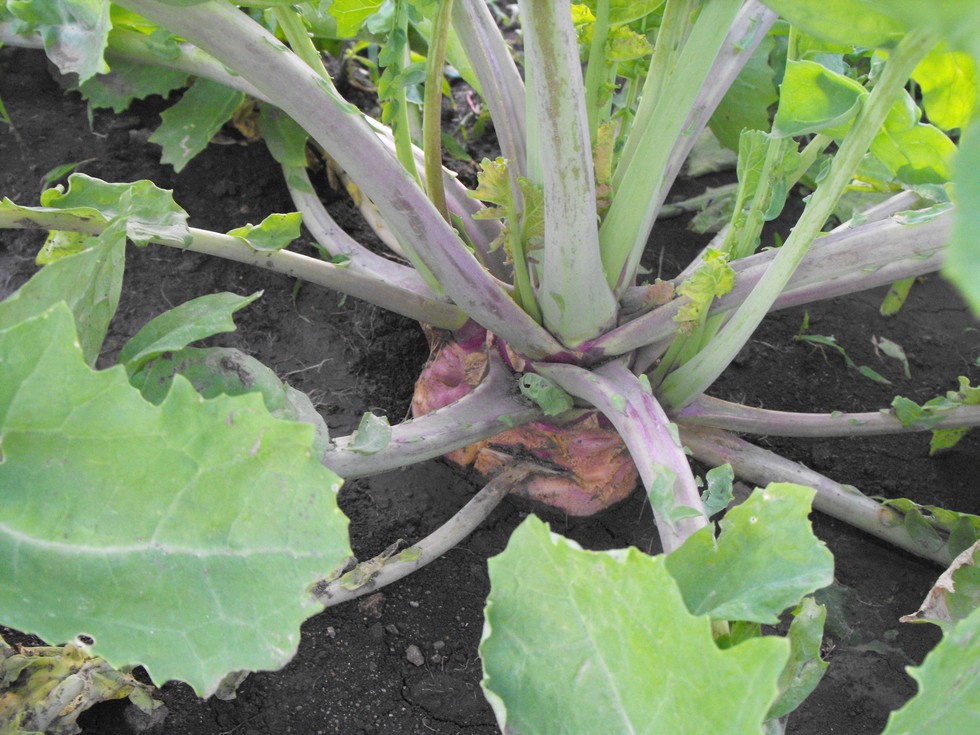 "Cornish Giant" Swede/Rutabaga 75.2 Thomas. I have 7 of these growing. First year I've grown these and they all look good. Its cool how the dirt start to crack all around the base of these and you know shes growin big below. This plant is about 3 feet across on the leaves and 7-8 inches top surface on the base.