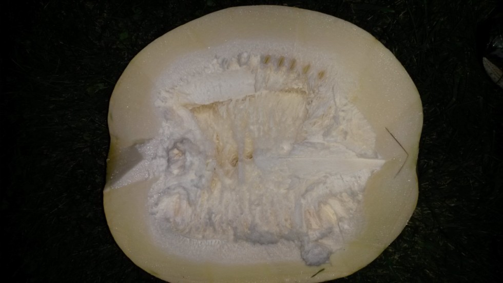 Found a 33 lb'r hiding in the jungle on my 829 Young State Fair plant. Cut it open and liked what I seen, THICK WALLS all the way around.