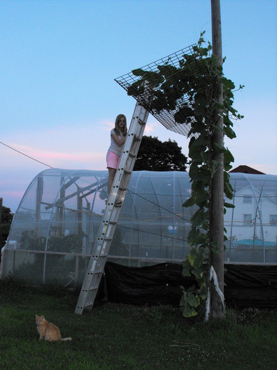 My daughter going up to pollinate a couple last LG's yesterday evening. She is 5'3" so you can see the LG set up is pretty well up there @ 14 ft. Got a couple LG's at the top back highest point at little over a 1 ft long.