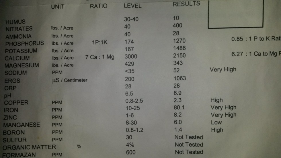 Okay this is March 2014 soil test of the high tunnel. Holy crappers. As for the NPK levels I was really worried about the nitrates. I watered a lot to try and tame that down. I let the plant grow to a 35 x 35 area in this 20 x 30 tunnel. I didn't prune many vines because I worried about blowing this pumpkin up. I had 3 1/2' tall leaf stalks on a lot of the plant. This was a huge plant and the 829 Young (2009 x 1725) was taking it and it's a grower. I noticed it stop growing 30 days before weigh off at an OTT of 809 lbs. 2 weeks later found soft spot and large crack on bottom front of pumpkin. 2 weeks later harvested and weighed 783 lbs.