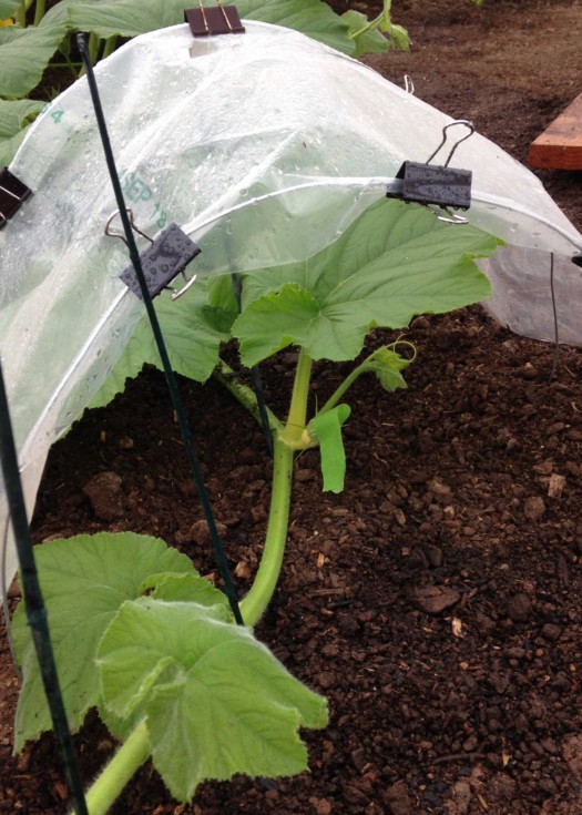 Well, it rained today. Big event in Phoenix. The forecasters said 1.50 inches. We got .45 inches at the garden. My rain gauges show I got .10 inches in the tunnels (I have the top 6 feet of the tunnel covered by insect cloth - the rest in greenhouse plastic). Anyway, I didn't want the female on the 1513 Sherwood to get wet, so I built a rain hat for it. Seems to work. Now if I can just her to open. (That's frog tape on the flower holding it closed. Don't want her to open until I'm there tomorrow.)