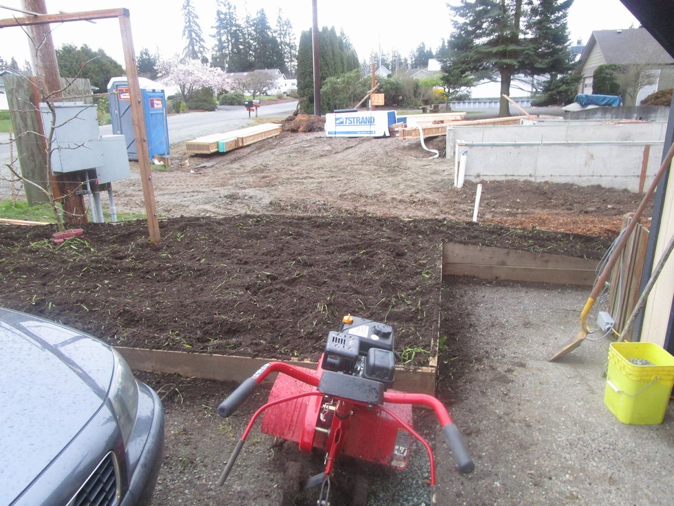 Got the amendments tilled in on the main patch. My Puyallup fair pumpkin last year was still growing well and was 82 days old when I harvested it. This year I am going to start 10 days earlier and see how that works. The 1623 is going to see the dirt on Wednesday. In other news they are finally building a house on the lot next door. I am hoping that it doesn't end up blocking off too much light.