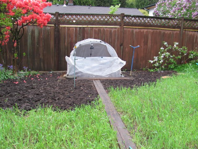 Upper patch and planting site ready to go. Been running tests with the smaller heat lamp in this hoop and it keeps the temperature inside overnight at around 50-55 degrees, when it is 40-45 degrees outside. I may up the wattage of the lightbulb...