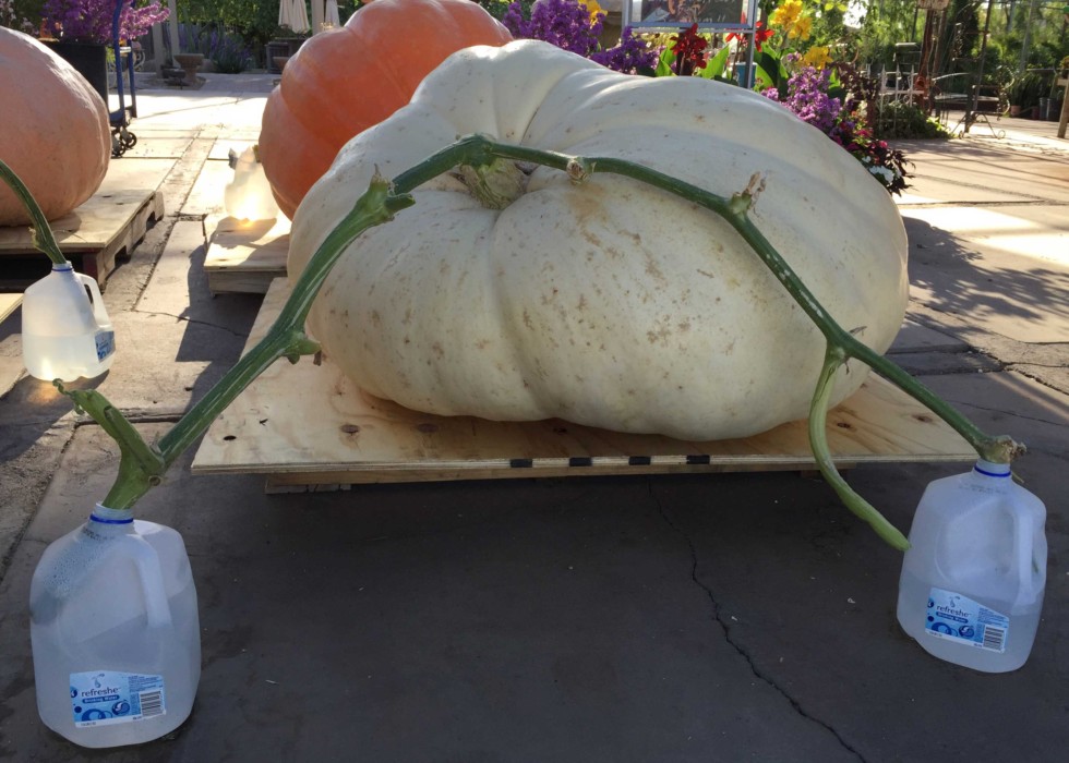 Next year I'm going to stuff the vines all the way to the bottom of the bottles. We staged the pumpkins Friday at 6 pm. We returned Saturday at 7:30 am and the pumpkins had consumed a full gallon of water. Would have been more if the vines hadn't lost contact with the water. It was only 105 degrees Friday and Saturday. Humidity was 5-7 percent. Everything, and everybody was thirsty.