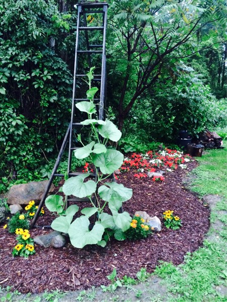 Long gourd growing fast now... Need to figure out sumthin for it to grow out onto so they can hang down...looks like sooner rather than later