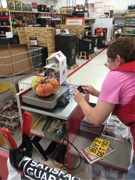 The lady at the tractor store needed to get pics for their contest..(and to show her mom) Cool story- her father that had passed used to grow giant tomatoes.. This one actually brought a tear to her eye while she talked about the slammers he use to grow...she said he would have loved to see it....almost brought a tear to mine!..nice lady