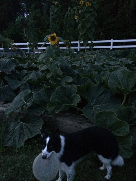 Here's Lily and a Sunflower that the birds planted...I think I've thrown the frisbee over 4 million times this summer.....the missus saved a chipmunk swimming in the water barrel today ..he lucky...