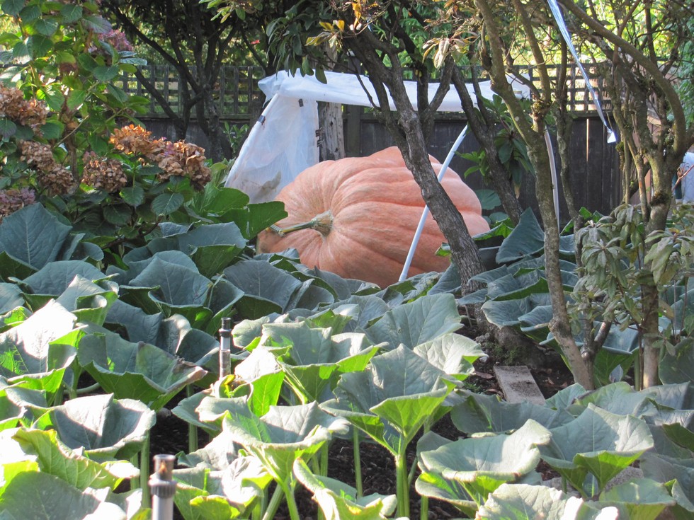 1124 Dixon (x 1126 Dixon) has the blanket taken off for a few hours so the overnight dew can dry off of it, and I rolled up the plastic for a photoshoot with a visiting buddy. Andrea likes this shot of the pumpkin...I must agree it is a good shot of it from the side. I've been permitted to "trim" some of the competing roto bushes so we'll see what the patch looks like for 2016...