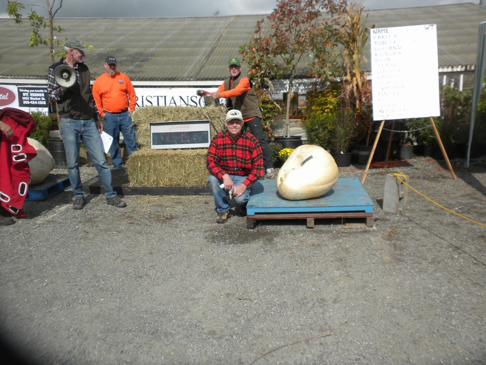 My Dad brought his straggler pumpkin. This Pumpkin literally had one vine and only the stump was in soil. 157.5 pounds