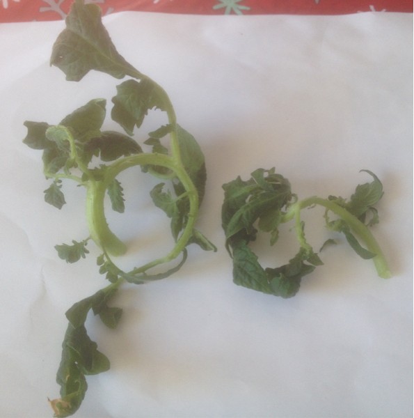 Weird growth on Big Zac tomato leaves (growing for the "Indoor Tomato Challenge"), petioles of new growth leaves are curling down, and leaflets curl up. What could be causing this?