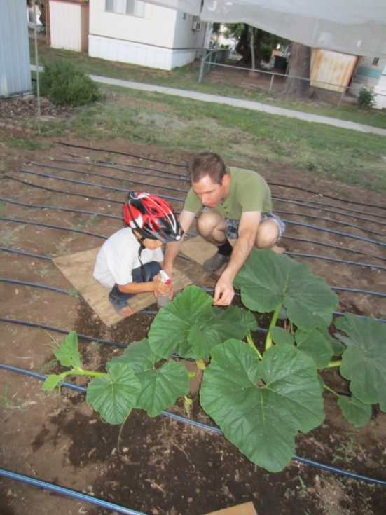 She's pushing 3 to 4 feet now and really taking off with our warm spell the last few days. I am teaching Joshua how to foliar spray in the photo! Good job buddy.