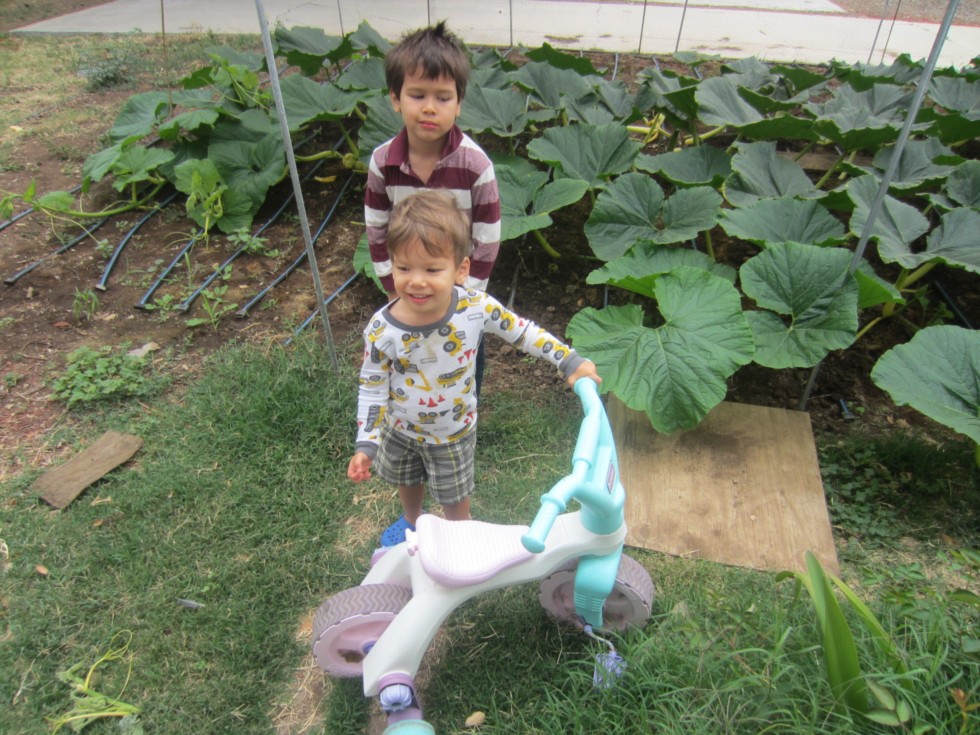 the bad! First time in pumpkin history, we lost our main vine pumpkin to a tricycle! lol Little Andrew has not hurt the plant in 2 months, yet he managed to run over the main vine pumpkin days before pollinating with his tricycle when papa wasn't looking. It was a direct hit, vine was fine, but pumpkin was creamed! Joshua looks happy. :(