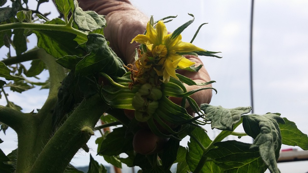 One of the 2 blooms that just seem to keep on blooming. Don't have a clue if it will develop all the way across or not but it sure is interesting. I keep using the toothbrush on them. If any plants abort they are finished since all new growth has been terminated. I'll start round 2 of my seeds in a week or two.
