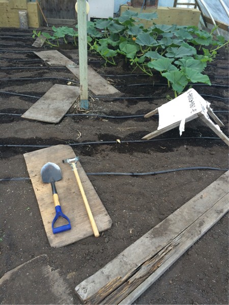 Here are my favorite tools for working on pumpkins. Small shovel for vine burying and a stirrup hoe with a cut handle. This is the 1213 Crews plant a day or so ago.
