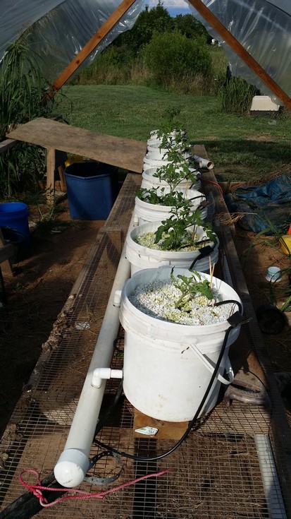 Just before leaving for Ohio I set up a different hydroponic system than I had previously used. Plants are cuttings from two plants grown in the earlier setup this year. Decided to grow them out of the weather in a small greenhouse at a level where I don't have to bend over. "Lazy" I can tie supports to the top of the greenhouse. It's a bit warm but the plants don't seem to mind. Actually they look better than their mothers at the same size. I've pinched out the earliest trusses as soon as I can detect them in hopes the next ones will be on stronger plants and produce some larger mega blooms. Time will tell. One of the 2 remaining AG's appears to be coming down with YVD. Will know in another day or two. I did try surgery again and removed a large portion of plant in hopes I got ahead of the disease. It's never worked before but I've got to try. I really want seeds from the cross. I will probably start a daily spray of antibiotics early in the morning with hopes the plant will absorb it and by some miracle it helps.