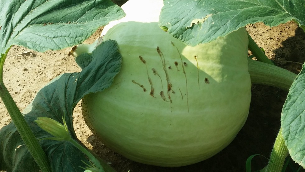 The 1047 Barlow plant is only about 125 square feet and has no stump. Just looking for seeds on what is left. This is the second time I've had coyote issues with pumpkins. A few nights back one reached out with it's paw to check it out. I wish this squash was darker but it was pollinated by the 694 Cantrell which was dark. It's on the 548.5 Cantrell. A second squash on the plant was pollinated by 1047 Barlow. Long way to go to get seeds here. Still having squash bug issues but NO where near the early numbers. Down to 6-10 per week. Monitor daily for pinching and spraying weekly. Most show up the last day or 2 before spraying. Been using Baythroid and Admire in combination.