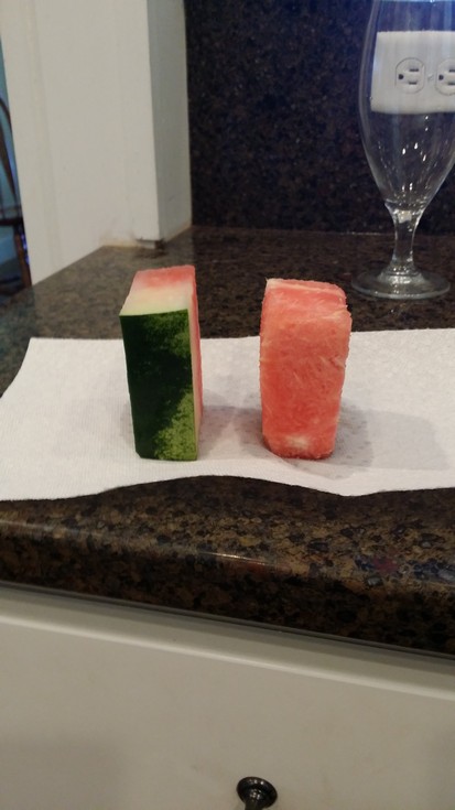 Got to harvest the seeds from one of the Terry melons and it gave me a chance to do a little test. I suspected the rind was more dense that the center but I needed to know for sure. I cut a section of each and after a bit of trimming I got them both to weigh 100 grams.