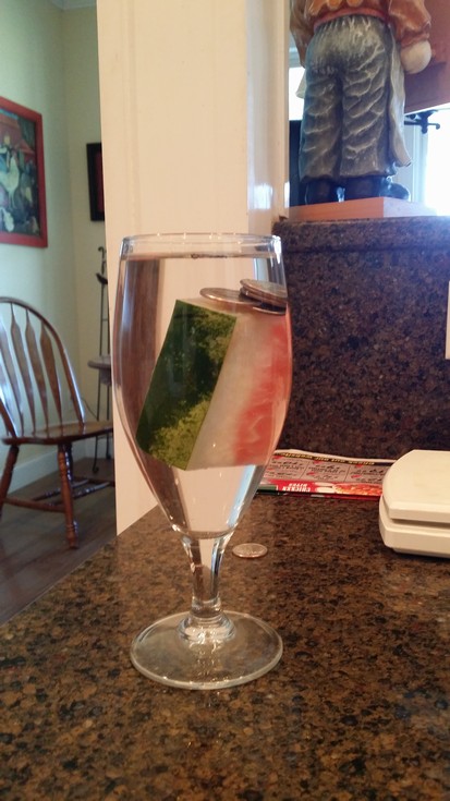 I put the rind piece in a glass with a measured amount of water along with 5 quarters to hold it down and I marked the level. The level was marked before and after putting in the piece.