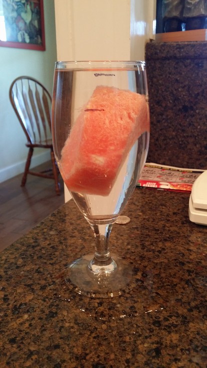 Next the heart piece was put in. Although not visible the same quarters were used again. As suspected the displaced volume went up telling me the rind is heavier per cubic inch. I've noticed over the years some melons, and lines of melons, have a great deal of white flesh around the seed area. I suspect it too may be heavier than the red. That's a test for another day. What does this mean? Maybe nothing. Maybe, if given the choice between to comparable seeds, go with the one that had a thicker rind. Do the taller melons have thicker rinds? Are those rinds more structurally sound? Could they be even more dense? What I do know is when my patch is done I have too much time to think. P.S. don't tell mama I used a Sharpie on one of her glasses.