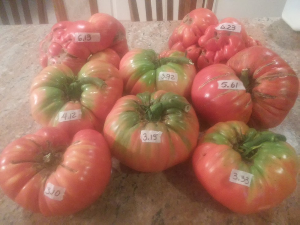 Here are many of the tomatoes picked at this time !!! all their weights are taped on them. Including the 5.61 MEGADOM !!! putting all the smaller tomatoes in front made the smaller ones look bigger than they were.