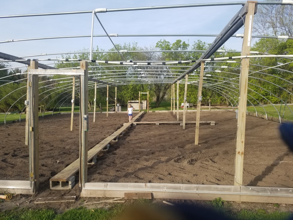 Raised walkway, need more cinder blocks, patch divided by 4 equal areas. 1 pumpkin plant and a watermelon in each section