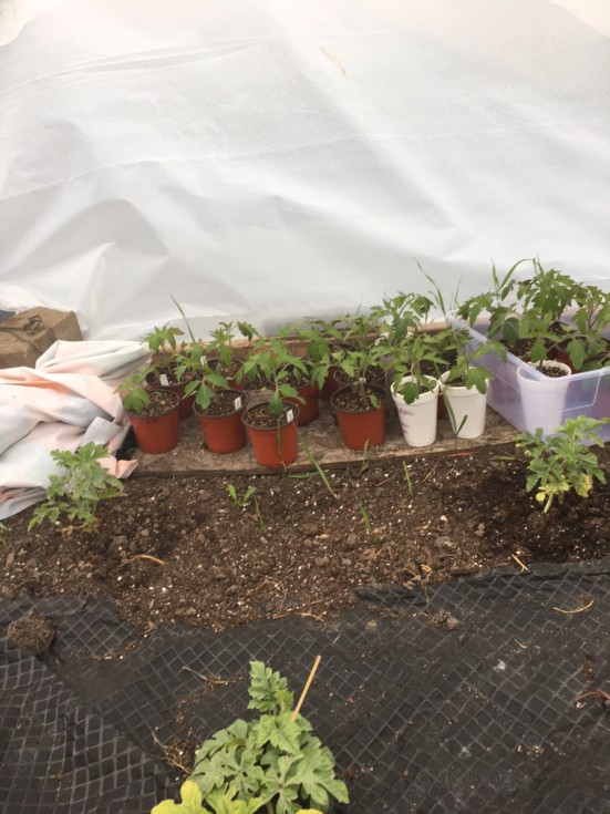 Here is the melon hoop with the rest of my maters waiting to get planted.....I may or may not have taken the picture like this on purpose to show how big my melon plant is....the plant goes several feet back into the hoop :\ ...planted my two back up plants in the hoop as well just in case.
