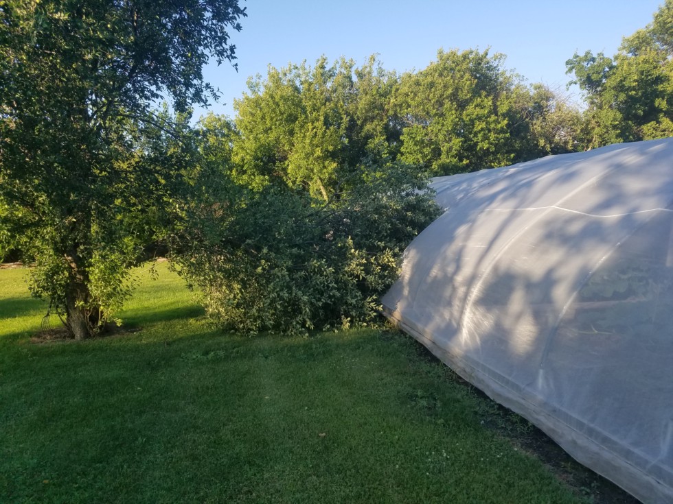 Screen houses not only protect from bugs, critters, wind and hail, but Apple trees as well! No damage, other than robbing from the short amount of time I get out there each night