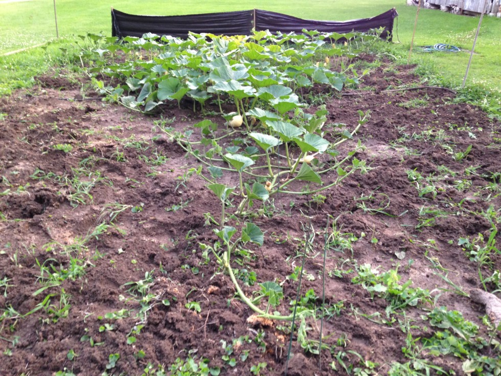 View of the 1844 Rose 61 days after transplanting to garden. It is ~I'm gonna call it 21 feet, I didn't get the tape out today~. More side vines are beginning to be terminated. Saw the first squash bugs in the garden today. Little buggars. I chopped their heads off with my shears.