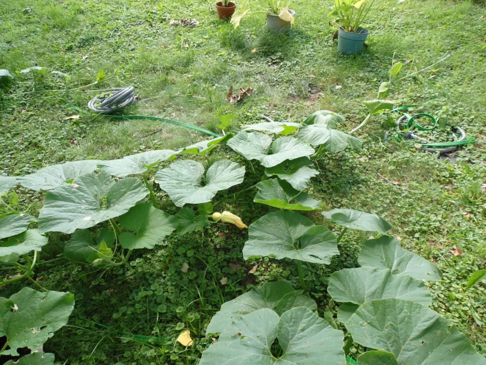 Attacked by bugs when putting up Japanese Beetle Trap. 2 Dragonflies came to my rescue and ate/chased away bugs that were attacking me. When the bugs were gone, They sat on the fence staring at me while I was finishing putting the trap together. The just bloomed Atlantic Giant flower looks like its going set. The flower at 10 feet is a day away from blooming. The white and Jarrahdale female flowers continued to grow. I am expecting a female flower to come out of the Porcelain Doll as one of its vines is approaching 7 feet. Its on a growing mission now that I fertilized all pumpkin plants a few days ago and the long vine is going to an area of the yard that gets lots of late afternoon and evening sun. Gave all plants extra water today because of heat the past few days.