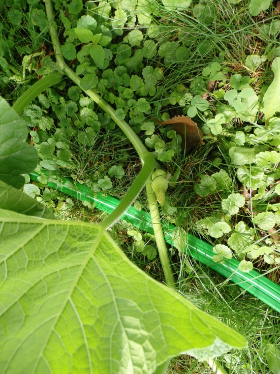 Female white flower approaching blooming time at 7 feet. Don't know how long or if it is going to die before blooming. White and Atlantic Giant vines are running over each other.