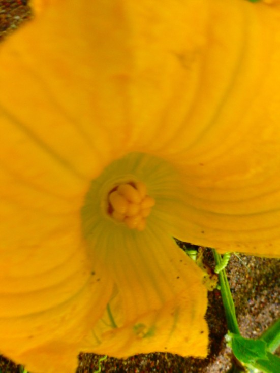 Giant Set 4 Female flower I self pollinated. Last 2 sets had little green pumpkins and huge female flowers. First 2 sets had little yellow pumpkins and small female flowers and aborted. Maybe sets 3 & 4 will set because they are different than sets 1 & 2. Set 3 has changed from a little green pumpkin a slightly larger yellow pumpkin. Hopefully both pumpkins will set but Set 4 is on a secondary vine coming off right before set 3. It wouldn't surprise me if one ends up being aborted.