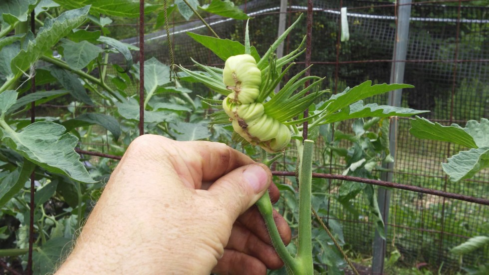Here is the replacement tomato for the one i just picked. All 3 of my megamutts gave only double flowers on their first set. That was disappointing. But maybe this will make up for it.