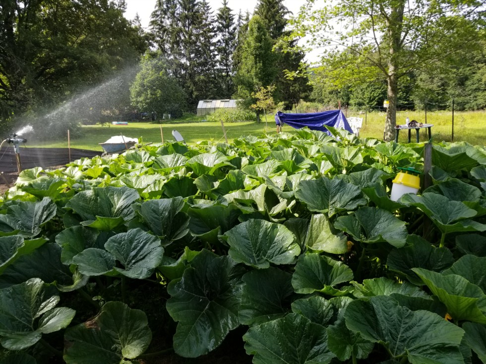 Here is the 1844 plant, back view. We trained many secondary vines backwards in an attempt to cram as much plant as physically possible behind the fruit. Plant size is currently about 625 square feet with 95% of it behind the squash. Very healthy plant, especially going into late august.