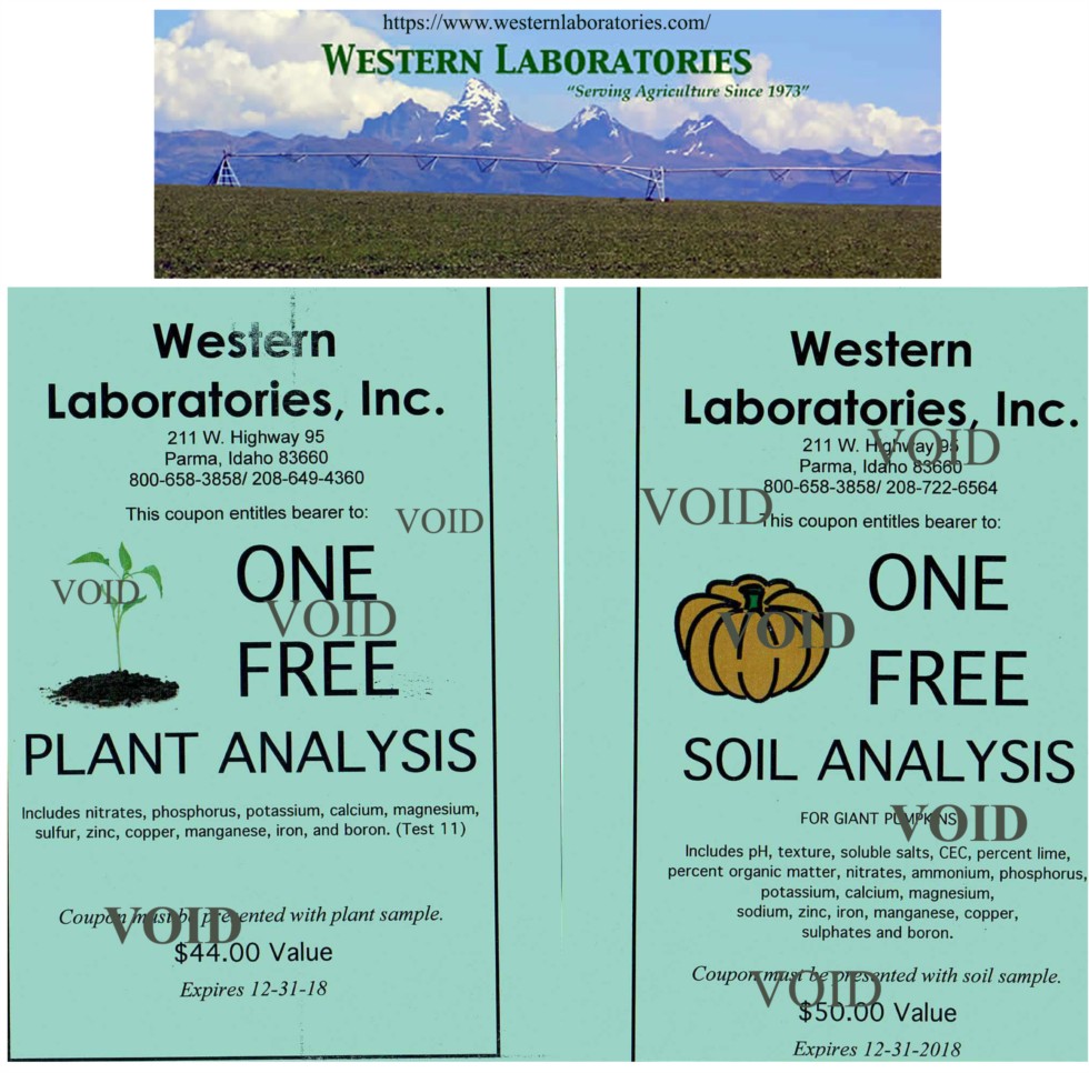 This item and many more will be at the IGPGA Silent Auction a $94 value these certificates expire 12-31-18. Western Laboratories has soil and tissue tests designed specifically for the Atlantic Giant pumpkin