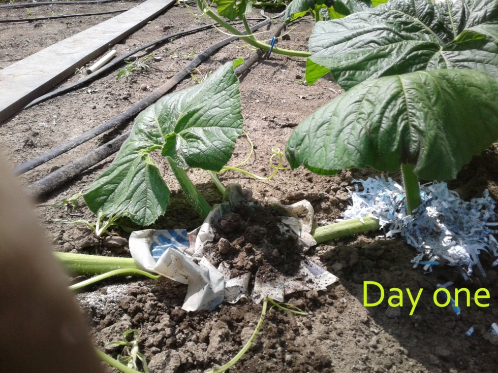 My newspaper ( 4 photos)experiment,I used both shredded and sheet newspaper to cover the rooting area of the vines. To see if its practical to use I simply dunked a handful of paper in water very quickly and slapped it on, as if in a hurry burying vines. I never watered the paper again but it did get rained on once, the paper was dry when I took these photos. In the shredded paper photo the sunlight is obscuring the root, but it looks similar to the roots under the sheet paper. I did this in 8 locations and at one of them the root grew into folds of the sheet paper and never reached the ground so shredded may be better. The paper has been on for 8 days, I dont know if there are practical ways to use this, it may be useful during heavy rains . I only added the dirt on top of one of the locations, it didn't seem to change anything