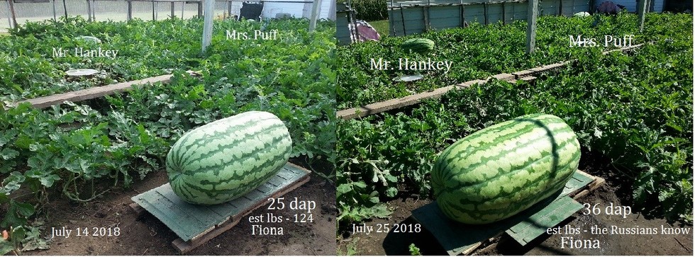 Fiona is back growing very strong after the rains and storm. Don't tell anyone but I've made a deal with a couple Russian melons not to disclose Fiona's weight. Mr. Hankey and Mrs. are very impressive at 27 dap ea.