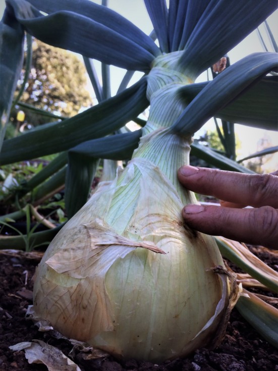 Onions are doing well. Ailsa Craig onions. Currently 18" in diameter. I have 30 about this size.