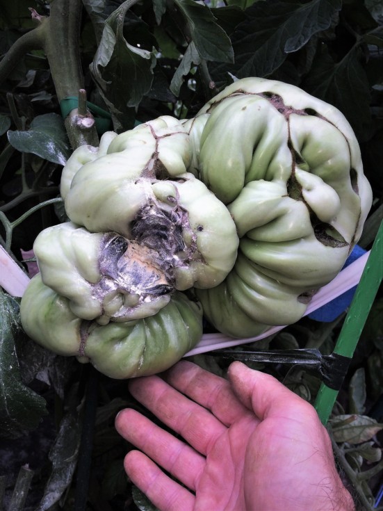 What can I say? The 5.95 Konieczny is still Krack'n, growing .50" per day. Currently at 26.50" and 33 dap. Should get another 10 days out of it. We have cooler weather coming up so it helps. Obviously, there is a healed BER that will have to be scrutinized the by the GPC. I am treating it daily with sulfur that will be washed off when harvested. The rules state, "All tomatoes must be healthy. A healthy tomato must be free of significant soft spots or leakage." "Skin can be cracked but not leaking". Sure it is an ugly spot, but it is not soft or leaking. It has healed over and is like leather. I work 100 miles from this tomato and have driven home almost every day to treat it and check up on it. The lengths I go to save a tomato. I need help and cannot wait for this tomato to be finished, however it turns out!