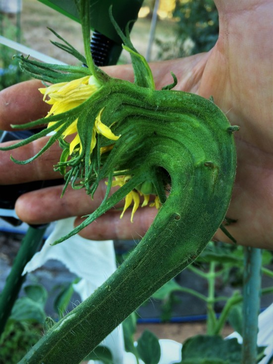 The absolute last pollination's of the year are these crazy huge blossoms. This one is from the Big Marley. Once again, how I get these things: I let the plant grow, no trimming. I set a tomato. I cut the large secondary's and main down like in half right above a leaf. Out of the stem cut grows this tertiary. If the timing is not too late you can pollinate one for the Fall weigh-off. This is not magic. You also have to make the right soil and use the correct amendments. I experimented with this last year and have been planning on these this year. I have around 10 like this. These are the largest.