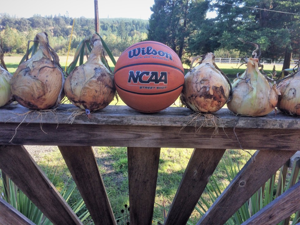 I've used that regulation basketball quite a few times this year. Goodbye big onions. You did good this year. Until next year. I'll bring a few to show and tell at the weigh-off. If anybody wants to give these a try, you have to be diligent and start them Dec-Jan. Just for normal big eating. I don't know how the British competitors do it. Email me [email protected]. I have a ton of seeds I grew this year.