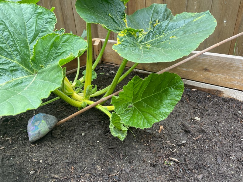 Planter mainly was to ensure safety while young and protect from cold etc. Soil also warms up faster and way better drainage. Bottom has a screen like sheet stapled to it to keep the vole or whatever it was from digging up. I also have an ikea bed tent (dome tunnel shaped that I got for $10) that fits the planter box great to shade it. Will be moved to pumpkin when one takes.