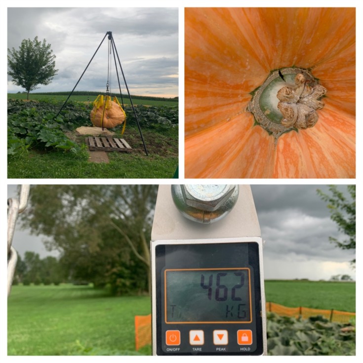 2112 Stelts DAP 48 :(RIP) Small crack on blossom end:/ Final Weight 1018Lbs at DAP 48 on my crane scale. Lifted with new Steve Handy tripod I purchased early this spring. I will harvest seeds tomorrow. This was a beautiful bright orange pumpkin with those white polkadots like the 2152 Ganter and 2261 Schmitt, that was starting to get really tall like it�s mother was. I�m aware it�s Way to late in the season, but today I pollinated one pumpkin on the 2112,2552,and 2528 all with my 2593 Patton. They only have 55 not so perfect weather days to grow till weigh off on worn out plants so I don�t expect them to grow anymore than 300-1,000lbs. But I loved this 2593 Patton so much I decided to cross them all with it for the genetics for next season!