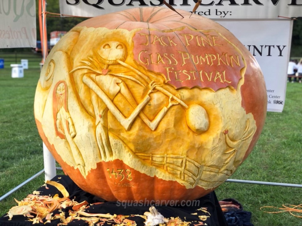 21� 1438 McMillin (2517 Haist x Self) This pumpkin was on display last weekend at The 2nd annual glass pumpkin festival in Hocking Hills Ohio, where Gus �Squashcarver� Smithhisler turned my 1438 McMillin into another one of his creative masterpieces. Check him out at Squashcarver.com #giantpumpkin #nightmarebeforechristmas again Gus thanks for your amazing work!