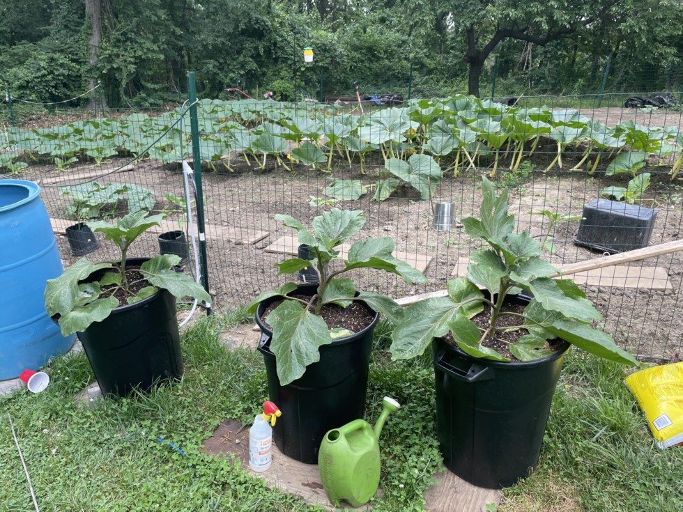 Over the winter I bought some giant eggplant seeds in an auction that are a strain of the WR at just over 6 pounds. We�ll see how close I can get to the record this year! I decided to grow them in 20 gal trash cans with pro mix as the root system doesn�t take up much space like a pumpkin does. The trash cans also help me keep the nutrients in their system longer. They are looking great so far