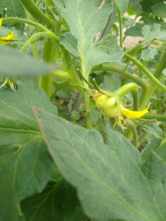 We have infant tomato. Looks like my pollination painting of the megabloom worked. (Or at least didn't hurt anything)